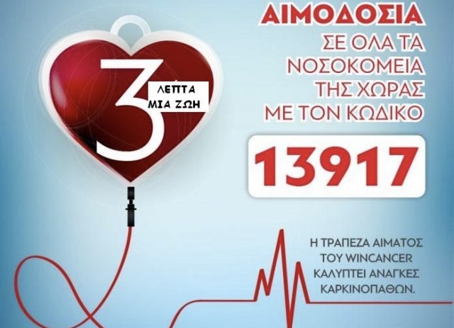 Σε όλα τα νοσοκομεία της χώρας, με τον κωδικό 13917, μπορείς να δώσεις αίμα για τους ασθενείς μας.