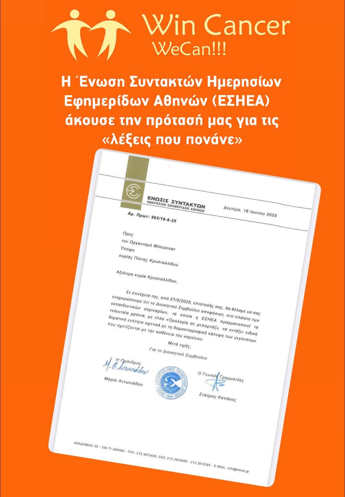 Σε αυτήν την ανάγκη αλλαγής γλώσσας και προοπτικής, το WinCancer πήρε την πρωτοβουλία να απευθυνθεί θεσμικά στην Ένωση Συντακτών Ημερησίων Εφημερίδων Αθηνών (ΕΣΗΕΑ). Με επιστολή που κατατέθηκε στις 27 Μαΐου 2025, ζητήσαμε να ενταχθεί στα εκπαιδευτικά σεμινάρια της Ένωσης ειδική θεματική ενότητα για τη δημοσιογραφική κάλυψη του καρκίνου και τη χρήση ενσυναισθητικής γλώσσας.