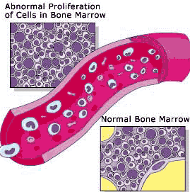 Όταν το άτομο νοσήσει από λευχαιμία, στο μυελό των οστών παρατηρείται μία υπερπαραγωγή παθολογικών (στη μορφή και στη λειτουργία) λευκών αιμοσφαιρίων που δεν επιτελούν την φυσιολογική τους λειτουργία που είναι η αντιμετώπιση των λοιμώξεων. Για αυτό η λευχαιμία ονομάζεται και καρκίνος του αίματος ή του μυελού των οστών.